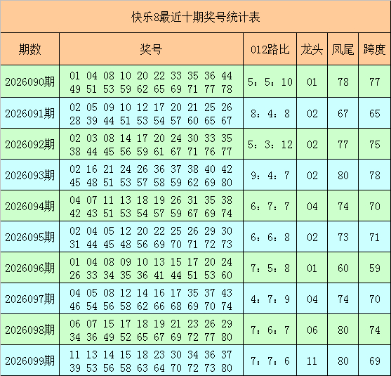 快乐8第2026099期奖号为:11 13 14 15 18 23 30 34 36 37 39 53 56 58 63 64 70 72 73 80,其中奖号012路比为7:7:6,0路号码(7个):15、18、30、36、39、63、72,1路号码(7个):13、34、37、58、64、70、73,2路号码(6个):11、14、23、53、56、80。